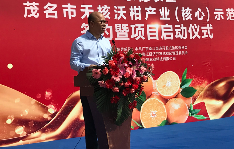 4月15日,绿本-乐穗农业茂名市无核沃柑产业(核心)示范区签约暨项目启动仪式在鉴江经济开发试验区百室堂村举行,该项目的启动实施,将有力地推动鉴江开发区的产业扶贫工作,助力乡村振兴。当日,市委副书记、代市长邓泽友,乐穗农业董事长冯春强,鉴江开发区党委书记邓砺锋,管委会主任曾桃以及茂名市委政法委驻百室堂村第一书记张卫民等领导出席活动。在政企领导和线上数千人的见证下,由化州鉴江经济开发区、绿本-乐穗农业和百室堂村委携手共建的“绿本-乐穗农业茂名市无核沃柑产业(核心)示范区”正式落户,首期300亩091无核沃柑已经按照标准化种植。